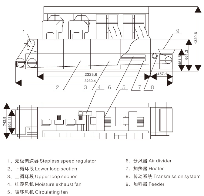 物料由加料器均勻地鋪在網(wǎng)帶上,網(wǎng)帶一般采用12-60目不銹鋼絲網(wǎng),由傳動裝置拖動在干燥機(jī)內(nèi)移動。干燥機(jī)由若干單元組成,每一單元熱風(fēng)獨(dú)立循環(huán),部分尾氣由專門濕風(fēng)機(jī)排出,廢氣由調(diào)節(jié)閥控制,熱氣由下往上或由上往下穿過鋪滿物料的網(wǎng)帶完成熱量與質(zhì)量傳遞的進(jìn)程,帶走物料的水份。網(wǎng)帶緩慢移動,運(yùn)行速度可根據(jù)物料溫度自動調(diào)節(jié),干燥后的成品連續(xù)落入收料器中。上下循環(huán)單元根據(jù)用戶需要可靈活配備,單元數(shù)量亦可根據(jù)需要選取。